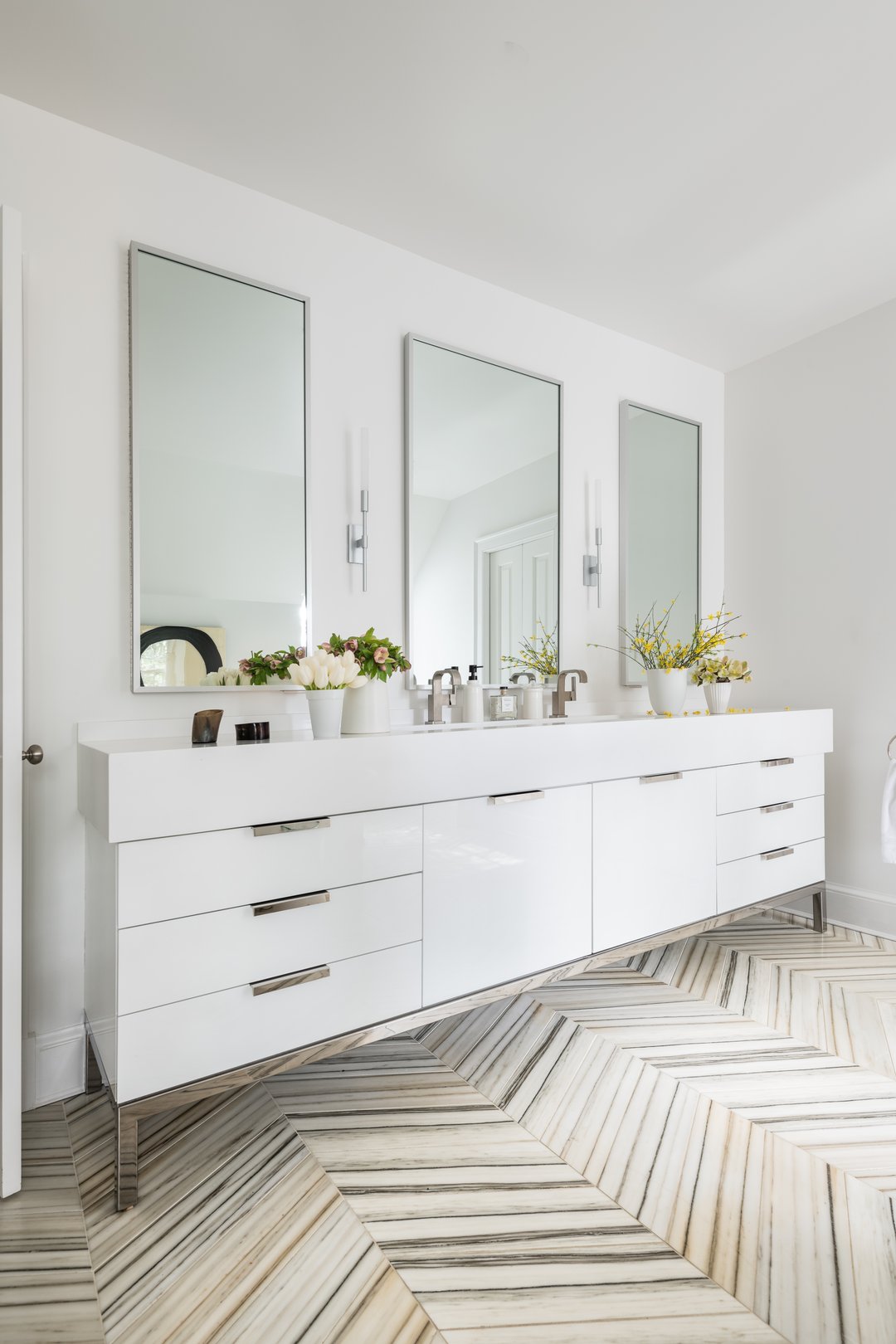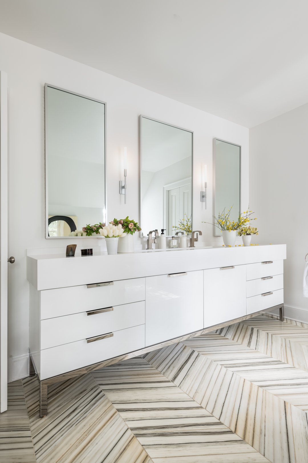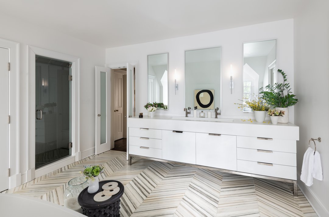Wonderful master bathroom design by Jodi Macklin and Meghan Browne in Chevy Chase, Maryland. The pure white vanity glistens against the marble tile.…