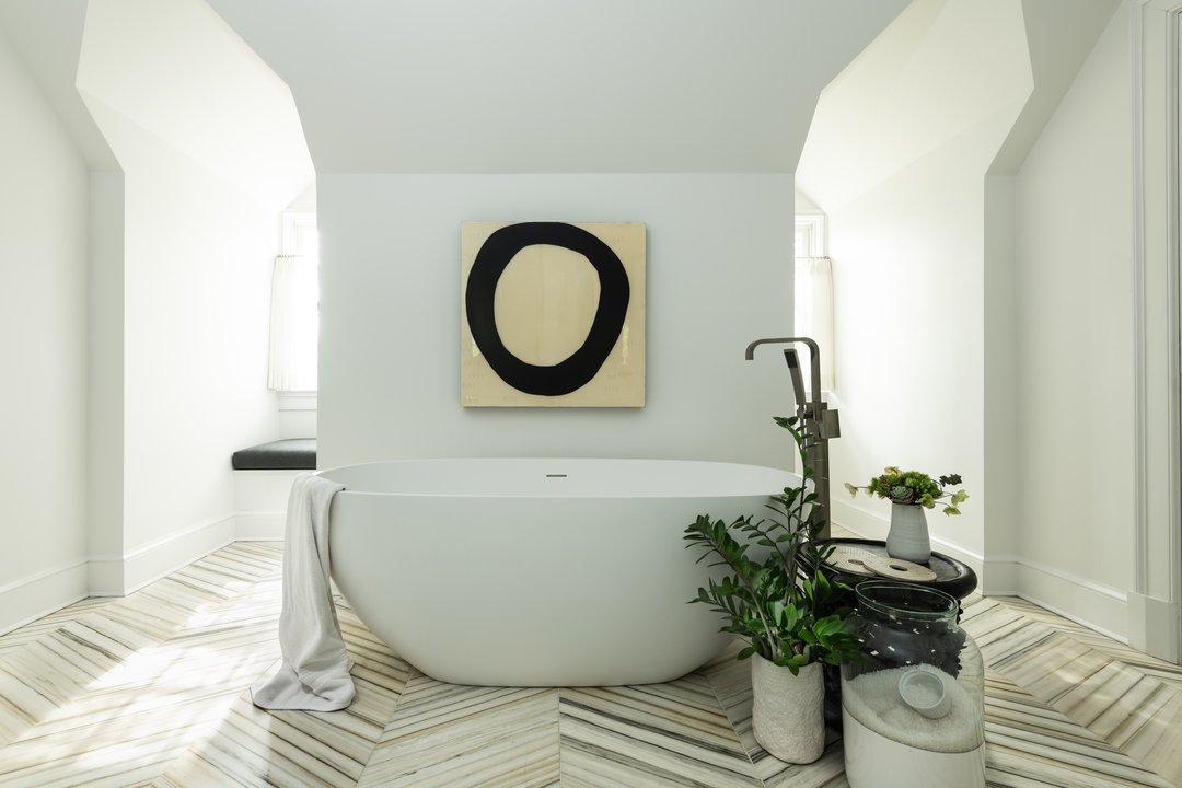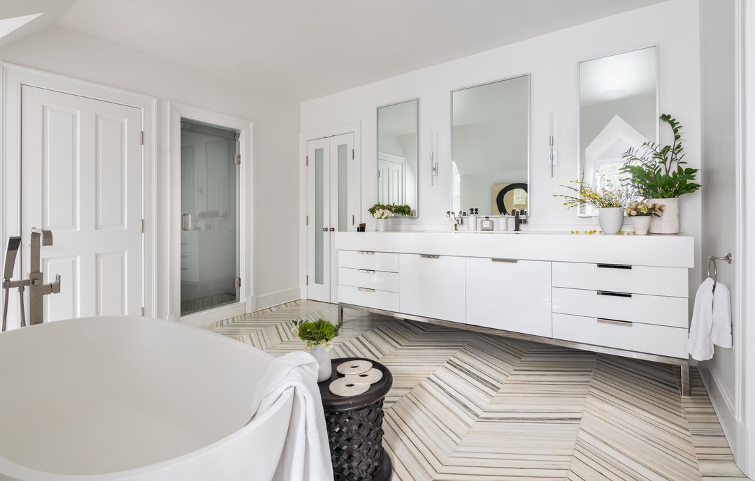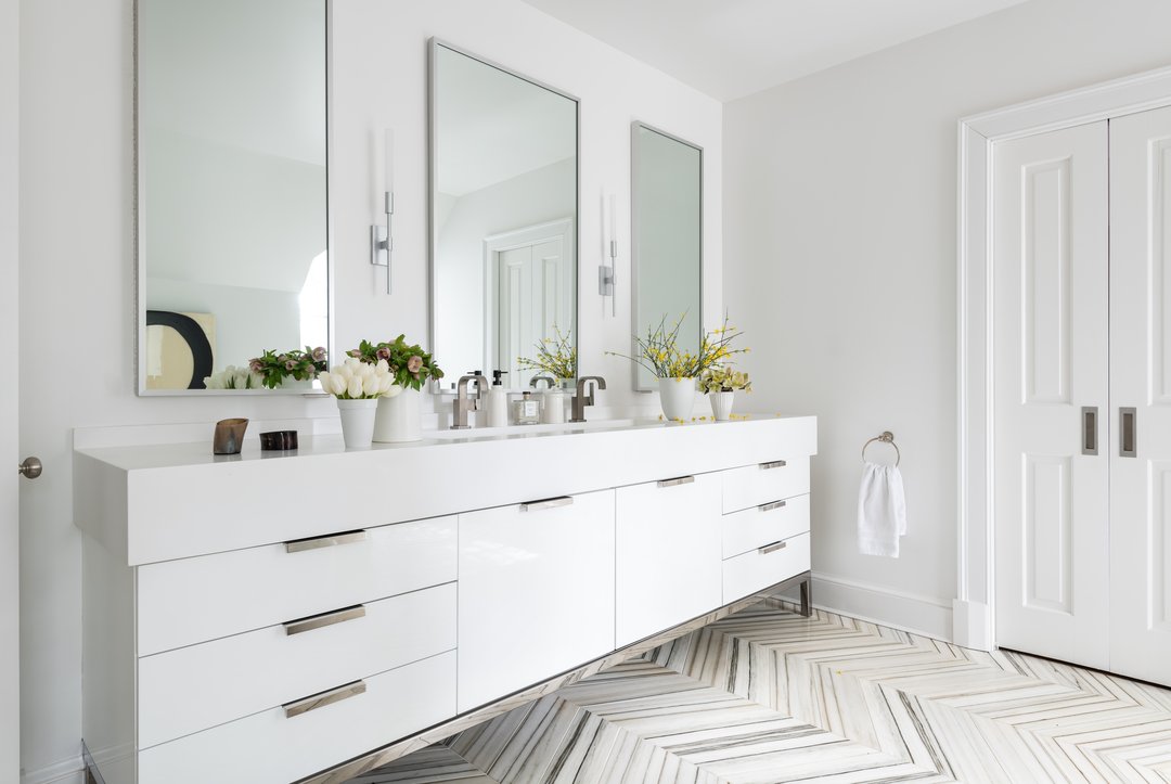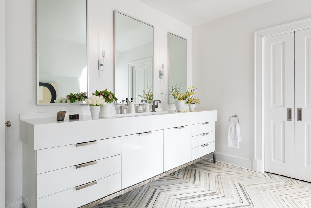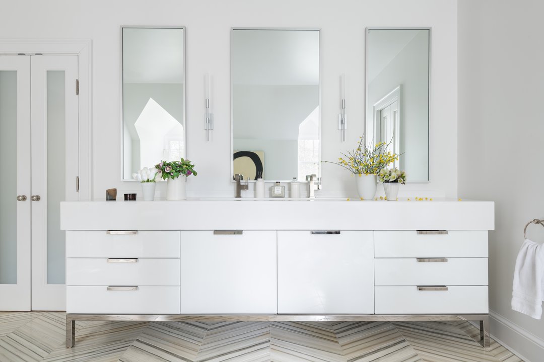 Wonderful master bathroom design by Jodi Macklin and Meghan Browne in Chevy Chase, Maryland. The pure white vanity glistens against the marble tile.…